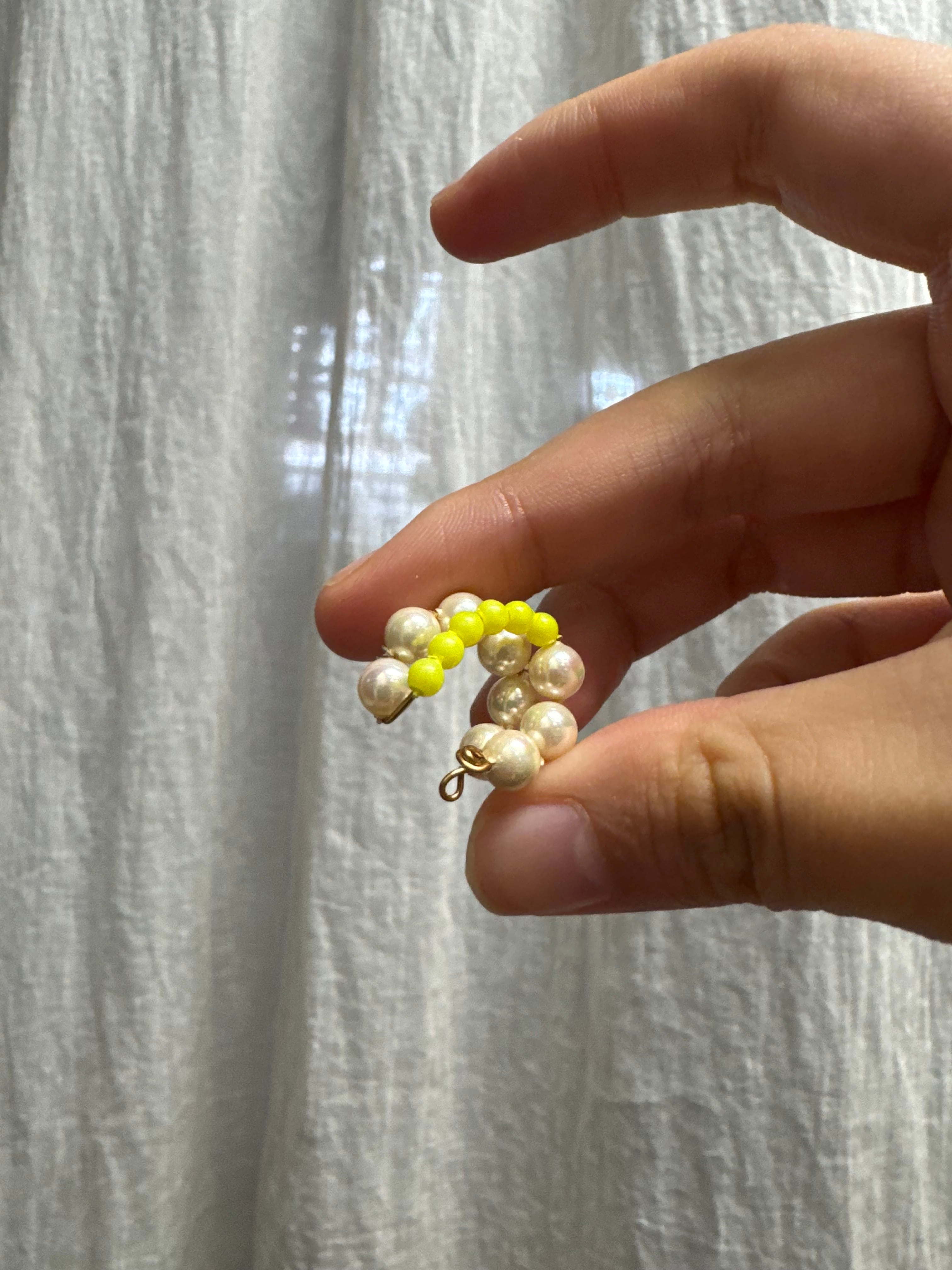 蛍光色イエローの樹脂パール2連イヤーカフ