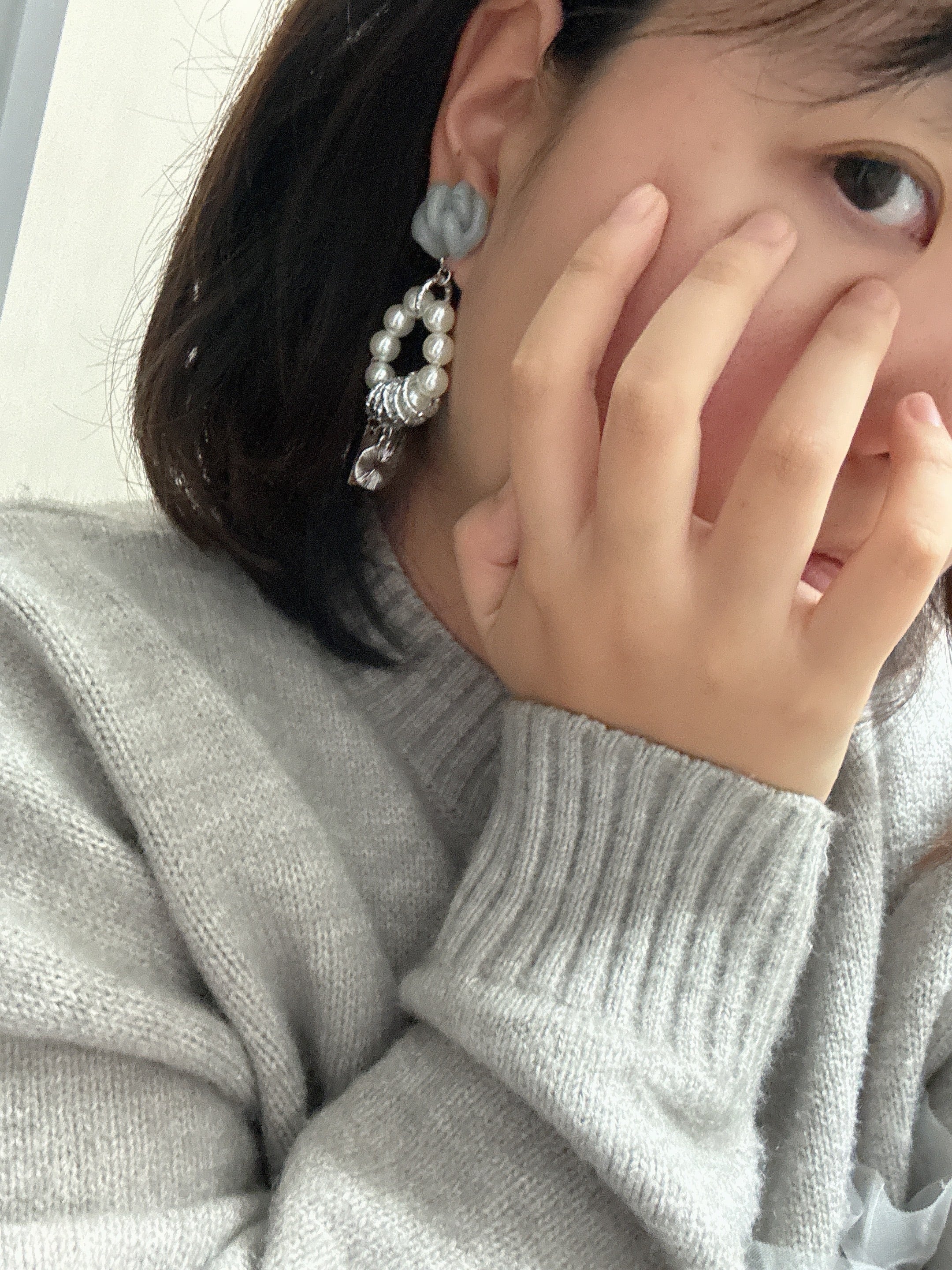 グレーアクリルニットパーツとパールフープのシルバーピアス