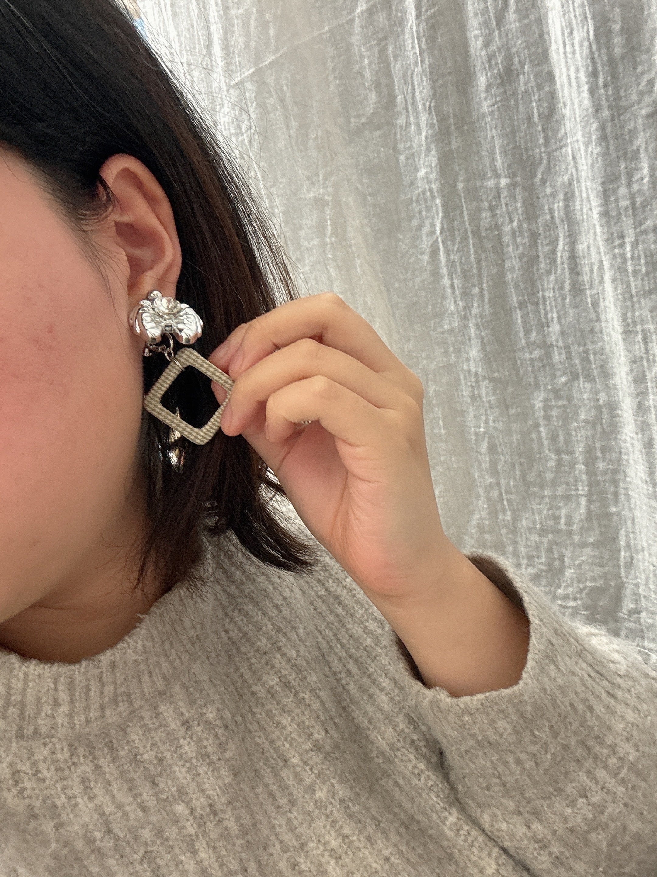 シルバーリボンとベージュチェックのフープイヤリング